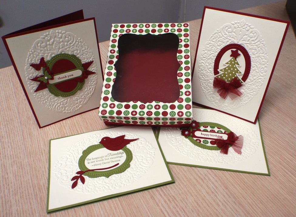 This is what we make at class last week. A gift box with four cards using the Holiday Frame Embossing folder. It would make a great gift. This box was inspired by Chiaki Haverstick. She has the most gorgeous tutorials.
